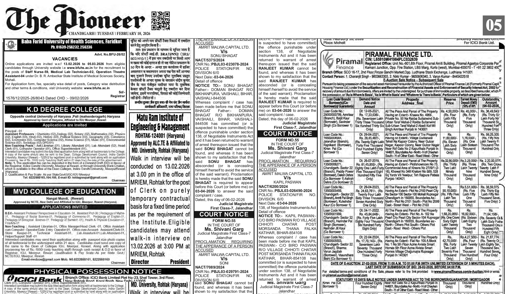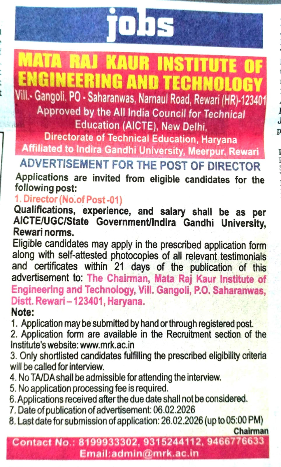 Corrigendum: advertisement for various posts in M. D. S. Degree College Digrota (Mahendergarh)