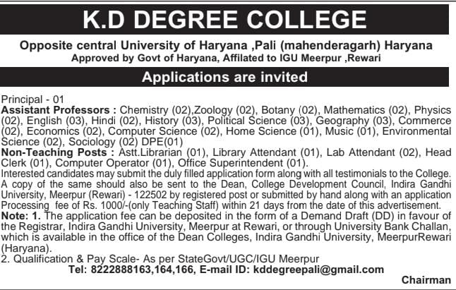 Advt. for various post in K.D. Degree College, Pali, Mahendargarh