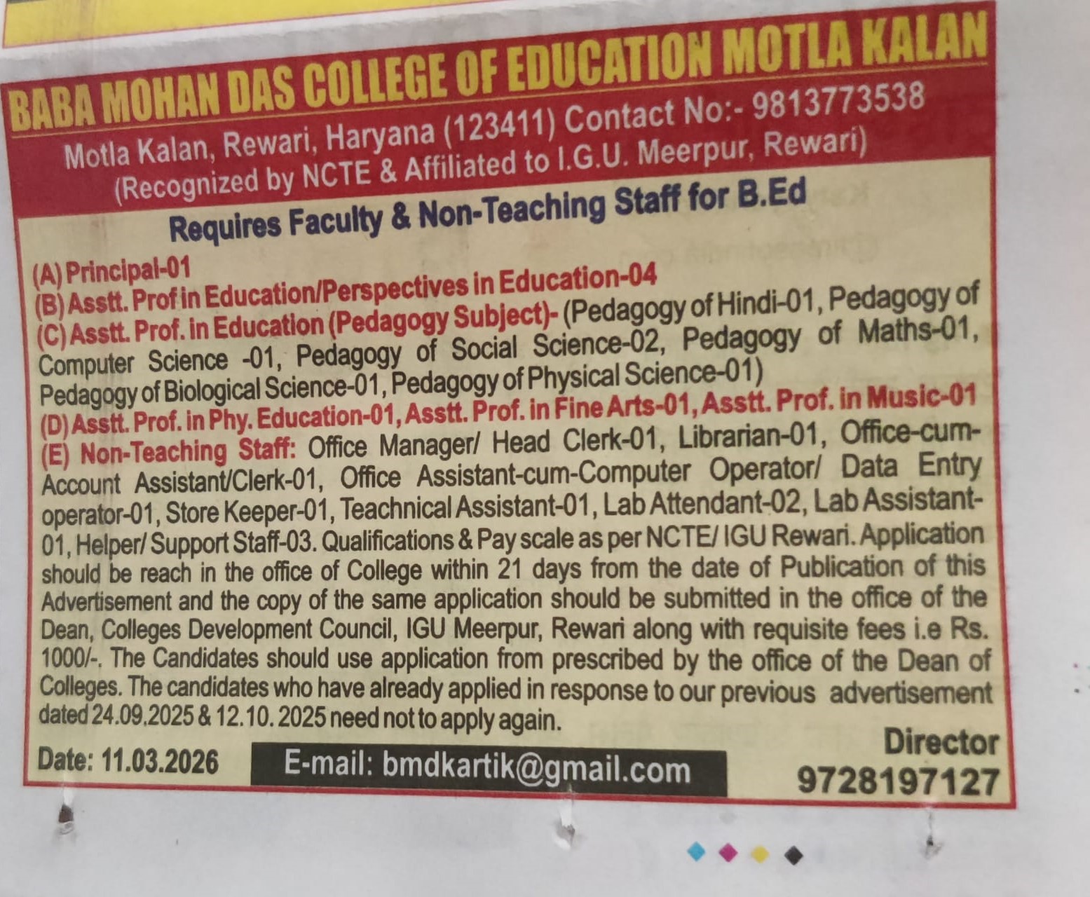 Corrigendum in Advertisement for Teaching and Non- Teaching Faculty in Baba Mohan Das College of Education, Motla Kalan, Rewari