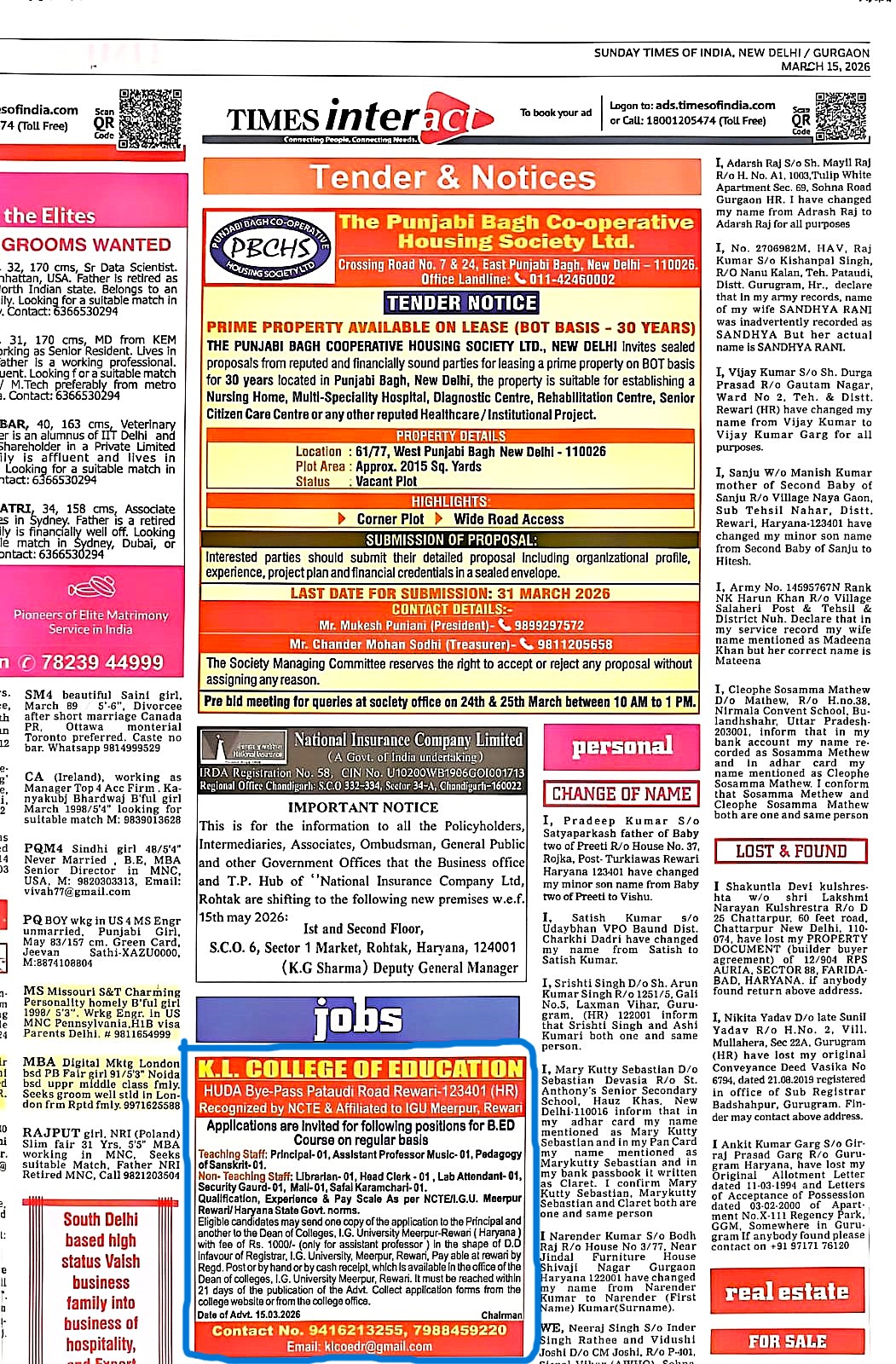 Advertisement K L College of Education Dohki, Rewari