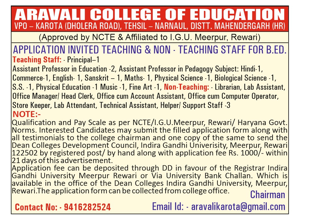 Advertisement of Teaching & Non-Teaching staff Aravali College of Education Karota