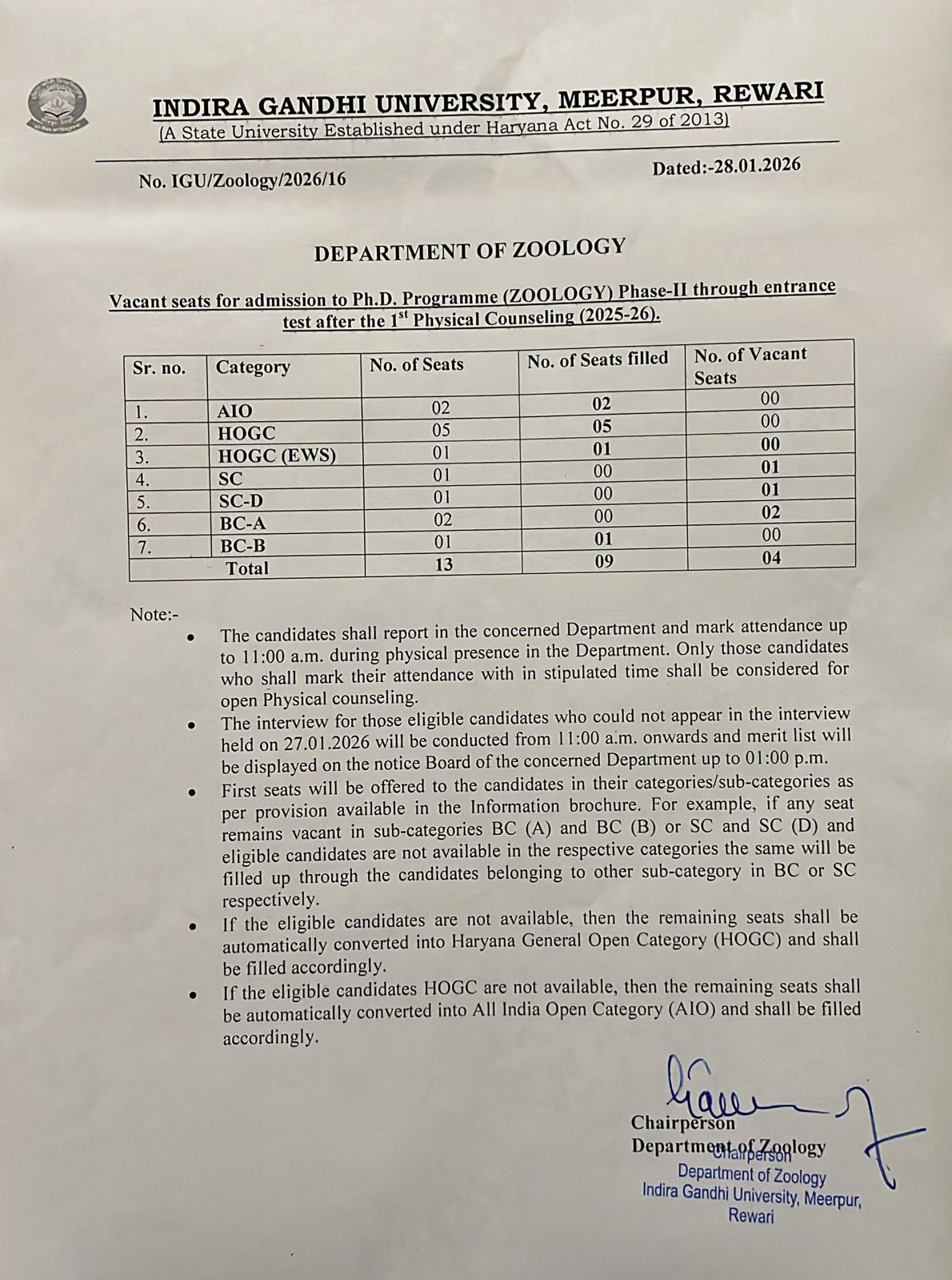Status of vacant seats in Ph.D Zoology
