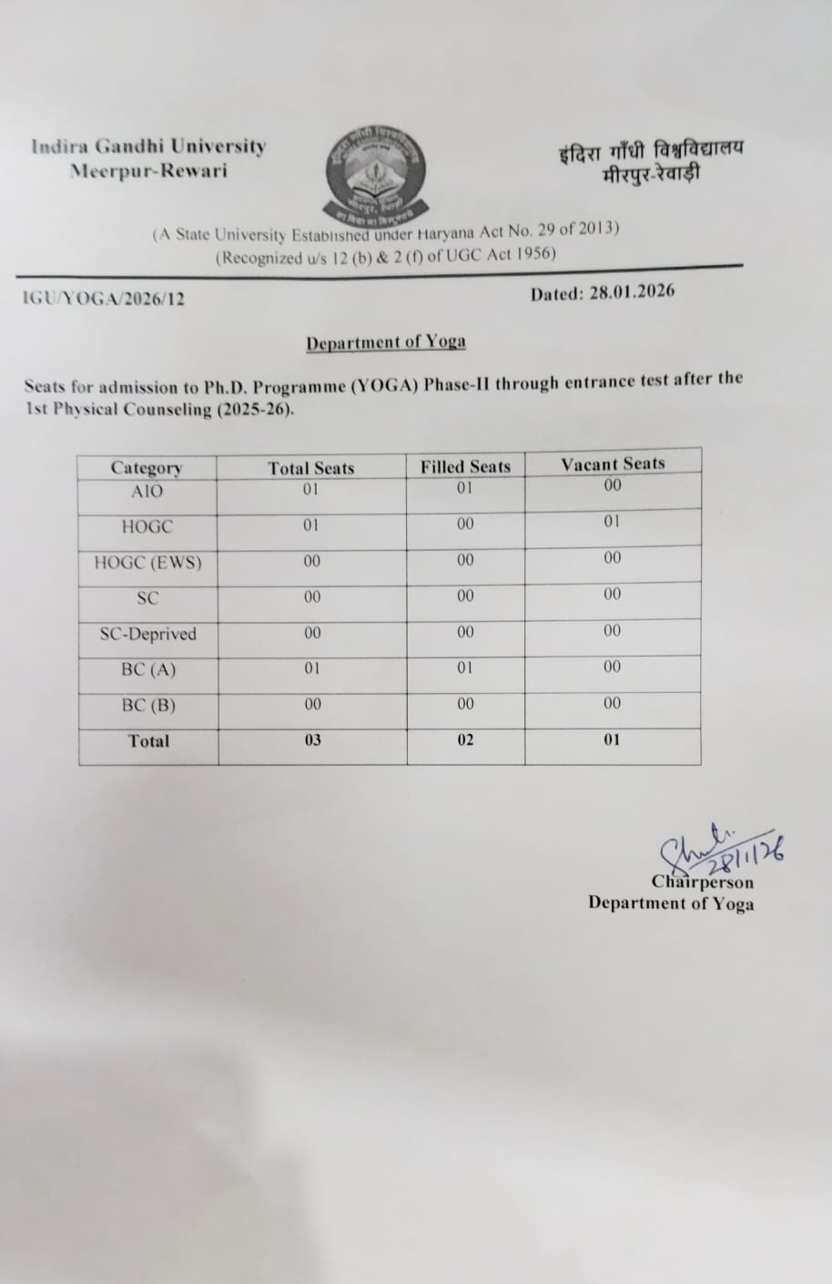 Ph.D. Vacant Seats Department of Yoga